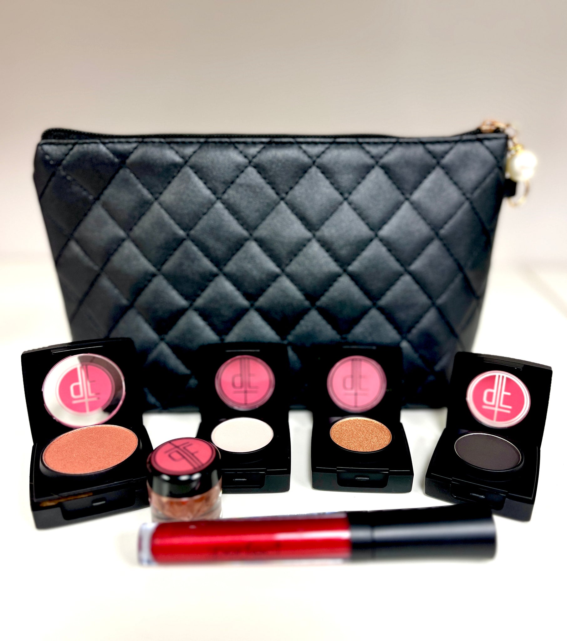 This all-in-one package includes 3 Eyeshadow Compacts RAEVAN, RADIANT, and NAKED, perfect for a bronzy, smoky eye. Also included is the bronzy Blush in Compacts in the shades COPPERTONE. Our Shimmer Pigment in the shade HEIRESS adds a touch of shimmer and sophistication to your look. Complete your makeup collection with our All Day Liquid Lipstick in the perfect holiday red FRANKLY SCARLETT. All of your items fit beautifully in our BLACK MAKEUP BAG. Elevate your gift giving this season with this must-have set.